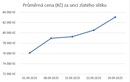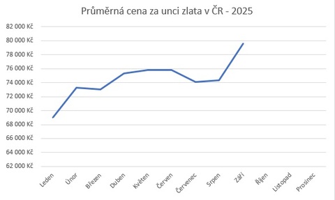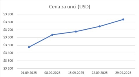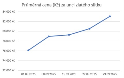 Cena na trhu komodity, jako je zlato, reaguje na poptávku a nabídku, kterou ovlivňují i události ve světě. Mezi základní faktory, které ovlivňují vývoj ceny zlata na burze, patří kurz amerického dolaru, inflace a výše úrokových sazeb. Pokud se budeme bavit o americkém dolaru, pak při znehodnocení měny dochází k tomu, že cena zlata stoupá. V případě zvyšující se inflace je vyvolána vyšší poptávka po tomto cenném kovu, a tím pádem dochází také ke zvýšení ceny. Posledním faktorem je výše úrokových sazeb, kde při poklesu úrokových sazeb cena zlata roste. Měsíční vývoj ceny zlata ve světě Nyní se podívejme na vývoj ceny zlata v průběhu září. Na začátku měsíce se trojská unce obchodovala za 3 476 USD. V následujících týdnech cena pokračovala v růstu – 8. září dosáhla 3 636 USD, o týden později 3 679 USD a 22. září se vyšplhala až na 3 747 USD. Září nakonec zlato uzavřelo na hodnotě 3 834 USD za unci, což znamená, že měsíc skončil výrazným nárůstem ceny. V září 2025 pokračovalo zlato v silném růstovém trendu, který začal již v předchozích měsících. Cena zlata se na začátku měsíce pohybovala kolem 3 600 USD za unci a během září dosáhla historického maxima 3 859,66 USD za unci ke dni 30. září. Tento nárůst o více než 6 % za měsíc byl podporován kombinací faktorů, včetně očekávání dalších snížení úrokových sazeb ze strany Federálního rezervního systému USA, pokračujících geopolitických napětí a rostoucí poptávky po zlatě jako bezpečném aktivu. V polovině měsíce, konkrétně 17. září, došlo k výraznému cenovému skoku na hodnotu 3 707 USD za unci po oznámení čtvrtbodového snížení úrokových sazeb Fedem. Tento krok, ačkoli očekávaný, způsobil krátkodobý optimismus na trhu. Nicméně, následné posílení amerického dolaru a obavy z politického zasahování do nezávislosti Fedu vedly k mírnému ochlazení cen zlata. Z technického hlediska zůstalo zlato v září v růstovém kanálu s klíčovou rezistencí kolem 3 800 USD za unci. Analytici upozorňují, že pokračující geopolitické napětí a možné zpomalení americké ekonomiky by mohly být katalyzátorem pro další růst v závěru roku. Trh nadále vnímá zlato jako atraktivní zajištění proti inflačním i politickým rizikům, a září tak potvrdilo, že investoři zůstávají vůči drahým kovům optimističtí. Datum | 1.9.2025 | 8.9.2025 | 15.9.2025 | 22.9.2025 | 29.9.2025 | Cena za unci (USD) | 3 476 $ | 3 636 $ | 3 679 $ | 3 747 $ | 3 834 $ |  Graf vývoje ceny zlata ve světě za září 2025 Autor: Finparáda.cz = Pro zvětšení klikněte na obrázek = Jak reagoval tuzemský trh prodejců zlata Na vývoj zlata reagovaly také vybrané tuzemské společnosti, konkrétně Česká mincovna, Česká spořitelna, Golden Gate, ZLAŤÁKY a Zlaté mince. U všech společností jsme mohli zaznamenat podobný vývoj a reakci na změny. Na konci srpna se průměrná cena za unci zlata pohybovala kolem 73 577 Kč. Na začátku září však výrazně posílila na 76 117 Kč a v průběhu měsíce dále rostla. K 8. září se zlato prodávalo již za 78 953 Kč, o týden později za 79 274 Kč a 22. září překročilo hranici 80 tisíc Kč. Září nakonec zlato uzavřelo na rekordní hodnotě 83 089 Kč za unci. Srovnání zlatých investičních slitků na Finparádě můžete nalézt zde. Společnosti | 1.9.2025 | 8.9.2025 | 15.9.2025 | 22.9.2025 | 29.9.2025 | Česká mincovna | 76 692 Kč | 78 735 Kč | 79 721 Kč | 80 886 Kč | 83 346 Kč | Česká spořitelna | 77 255 Kč | 80 098 Kč | 80 409 Kč | 82 107 Kč | 84 481 Kč | Golden Gate | 77 768 Kč | 80 640 Kč | 80 913 Kč | 82 262 Kč | 84 753 Kč | ZLAŤÁKY | 74 900 Kč | 78 822 Kč | 78 661 Kč | 79 600 Kč | 81 900 Kč | Zlaté mince | 73 968 Kč | 76 468 Kč | 76 668 Kč | 77 868 Kč | 80 965 Kč | Průměrná cena za unci | 76 117 Kč | 78 953 Kč | 79 274 Kč | 80 545 Kč | 83 089 Kč |  Vývoj ceny zlata na tuzemském trhu za září 2025 Autor: Finparáda.cz = Pro zvětšení klikněte na obrázek = Datum | Duben | Květen | Červen | Červenec | Srpen | Září | Zlatoindex | 75 298 Kč | 75 830 Kč | 75 829 Kč | 74 123 Kč | 74 322 Kč | 79 595 Kč | *Zlatoindex - Průměrná cena za unci zlata u tuzemských obchodníků v daném kalendářním měsíci  Zlatoindex - Září 2025 Autor: Finparáda.cz = Pro zvětšení klikněte na obrázek = Žebříček podílových fondů |  | Kalkulačka zlata a stříbra |  | Sjednání investic |  |