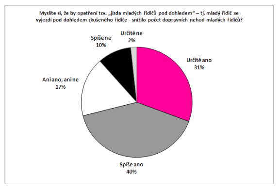 pod dohledem zkušenějších kolegů by podle 31 % dotázaných určitě pomohla snížit počet dopravních nehod mladých řidičů. Dalších 40 % dotázaných má za to, že by takové opatření pravděpodobně pomohlo.