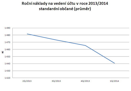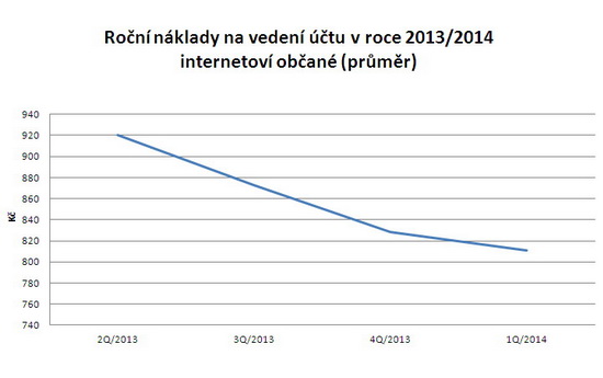 Podle analýzy nákladů na vedení a využívání účtu standardního klienta v ČR se objem peněz, které celkově klient zaplatí za účet za rok, v posledním čtvrtletí, tj. od ledna do března 2014, snížil z 1 466 korun na 1 441 korun, tj. o 0,3 %. Meziročně tyto náklady dokonce poklesly o 7,6 % z loňských 1 560 korun (údaj k 31. březnu 2013). Roční náklady na využívání běžného bankovního účtu v ČR po čtvrtletích: | 2.Q / 2013 | 3.Q / 2013 | 4.Q / 2013 | 1.Q / 2014 | | 1 482 Kč | 1 473 Kč | 1 466 Kč | 1 441 Kč | Zdroj: Scott & Rose Pozn: Náklady jsou vypočteny pro modelového „průměrného“ (standardního) klienta, jehož chování je uvedeno níže, a to tak, že výpočet proběhne pro všechny nabízené účty / balíčky jednotlivých retailových bank v Česku a ty jsou následně zprůměrovány.  Vývoj průměrných ročních nákladů na využívání běžného účtu v českých bankách po čtvrtletích - standardní klienti Autor: Scott & Rose Meziroční srovnání nákladů na využívání bankovního účtu v ČR: | k 31.3.2013 | 1560 Kč za rok | | k 31.3.2014 | 1441 Kč za rok | Zdroj: Scott & Rose O pokles nákladů na využívání běžného účtu pro klienty bank v Česku se v prvním čtvrtletí zasloužily především ČSOB a GE Money Bank. ČSOB zrušila poplatek za změnu jednorázového i trvalého příkazu k úhradě, k inkasu, svolení k inkasu, včetně SIPO přes ČSOB InternetBanking 24, ČSOB SmartBanking a ČSOB Linku 24, který před tím činil 6 korun. GE Money Bank pak zavedla nové konto Genius Free & Flexi, které má takové poplatkové schéma, které znamená nižší než průměrné náklady na vedení účtu v tuzemsku. Vážené roční náklady na využívání běžného bankovního účtu v ČR po čtvrtletích | 30.6.2013 | 30.9.2013 | 31.12.2013 | 31.3.2014 | | 1 911 Kč | 1 913 Kč | 1 913 Kč | 1 873 Kč | Zdroj: Scott & Rose Pozn: Náklady jsou vypočteny pro modelového „průměrného“ (standardního) klienta, jehož chování je uvedeno níže, a to tak, že výpočet proběhne pro všechny nabízené účty / balíčky jednotlivých retailových bank v Česku a z nich je následně vypočten vážený průměr, kde váhy odpovídají počtu klientů jednotlivých bank. Vážené roční náklady na využívání běžného účtu v posledním čtvrtletí poklesly z 1 913 korun na 1 873 korun, tj. o 2,1 %. Meziroční snížení pak činí 2,8 % (z 1 927 korun na 1 873 korun ročně). Internetový klient Klienti, kteří se snaží využívat bankovní účet úsporně, tzn., že provádějí platby jen elektronicky a vybírají jen z bankomatu vlastní banky, by ve srovnání s minulým čtvrtletím také ušetřili, a to 17 korun za rok, jelikož průměrné náklady pro internetového klienta za rok by činily ke konci prvního čtvrtletí letošního roku 811 korun oproti 828 korunám ke konci předchozího čtvrtletí (ke konci roku 2013). Meziročně by z peněženky vydali opatrní klienti o 189 korun méně, tj. o 18,9 % (snížení z 1 000 korun na 811 korun ročně). | 2.Q / 2013 | 3.Q / 2013 | 4.Q / 2013 | 1.Q / 2014 | | 920 Kč | 873 Kč | 828 Kč | 811 Kč | Zdroj: Scott & Rose Pozn: Náklady jsou vypočteny pro modelového „internetového“ klienta, jehož chování je uvedeno níže.  Vývoj průměrných ročních nákladů na využívání běžného účtu v českých bankách po čtvrtletích - internetoví klienti Autor: Scott & Rose  Chování internetového a průměrného (standardního) klienta. Autor: Scott & Rose
