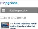 Jako dárek ke třetímu výročí Finparády si můžete pohodlně kdekoliv pomocí svého chytrého mobilního telefonu najít parametry Vámi vybraného finančního produktu. Stačí na mobilu najít web Finparada.cz, na hlavní stránce zvolit v horním menu volbu „Přehled produktů“ (viz fotogalerie). Následně se Vám zobrazí rozcestník pro všechny typy finančních produktů, které Finparáda.cz sleduje (viz fotogalerie). Po výběru typu produktu se dostanete na přehled všech produktů vybraného typu od všech bank, případně záložen a dalších finančních institucí působících v České republice (viz fotogalerie). Nyní stačí vybrat konkrétní produkt a zobrazit si všechny jeho parametry, jako jsou úroková sazba, poplatky, podmínky poskytnutí apod. (viz fotogalerie). Přejeme Vám příjemné a efektivně strávené chvíle s Finparádou.cz.