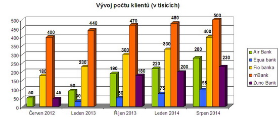V nedávné době se pochlubily některé nízkonákladové banky nárůstem počtu svých klientů. Air Bank letos získala 70 000 nových klientů. Celkově má banka více než 280 000 klientů. Fio banka během letošního roku k sobě přitáhla více jak 70 000 nových klientů. Jejích služeb využívá celkově přes 400 tisíc osob. ZUNO Bank napočítala od počátku tohoto roku 30 000 nových klientů. V České republice a na Slovensku má tak celkově 230 000 klientů. Čísla za jednotlivé země nezveřejňuje. Je však nutné poznamenat, že výše uvedené počty nejsou unikátní klienti, jelikož někteří občané mají účty u více bank a jejich služeb využívají dle nejlepší nabídky. Trocha historie První nízkonákladovou bankou, která vstoupila na český trh, byla v listopadu 2007 mBank. Následována byla v září 2010 Fio bankou (v tomto případě nešlo o vstup úplně nového subjektu na náš trh, ale o přerod družstevní záložny a burzovní společnosti Fio v bankovní subjekt). Hlavní vlna přišla v roce 2011. V červenci se objevila ZUNO Bank, v září Equa bank a listopadu Air Bank. To, jak se vyvíjely počty klientů u jednotlivých bank, ukazuje následující graf:  Vývoj počtu klientů nízkonákladových bank od roku 2012 do roku 2014 Autor: Finparáda.cz Pro zvětšení klikněte na obrázek. Zdroj: Banky Pozn. data za Zuno Bank jsou souhrnná za ČR a SK Co se skrývá za čísly vykazovanými bankami? Vysoké počty klientů Fio banky a mBank jsou dány zejména dřívějším vstupem obou subjektů na trh a nabídkou produktů i pro právnické osoby. Za letošním růstem klientů u Fio bank může stát zvýšená marketingová podpora účtů bez poplatků. Výrazný nárůst klientů Air Bank v roce 2013 byl způsoben zejména nabídkou vysokého úroku na běžném účtu a držením tzv. TOP 3 garance na spořicím účtu. Banka nabídku svých produktů trvale podporuje velmi masivní reklamou. Equa bank zatím vykazuje opticky nejnižší počet nových klientů. Od začátku je její nárůst velmi pozvolný, bez výraznějších výkyvů. Je třeba říci, že v počátcích byly reklamní aktivity banky výrazně nižší než u konkurence. ZUNO Bank jako jediná nemá žádné pobočky a další nárůst počtu jejích klientů bude záviset i na tom, jak se lidé s touto situací vyrovnají - zda se bez poboček v budoucnu úplně obejdou nebo ne. Rostoucí počty klientů neznamenají, že tyto banky mají na českém trhu vyhráno. Zisk dokázaly vygenerovat za celý minulý rok Fio banka a mBank. Air Bank přešla do černých čísel v prvním pololetí letošního roku. Aktivita nízkonákladových bank měla u jejich konkurence dokonce takový ohlas, že i velké banky začaly svým klientům nabízet tzv. „bezpoplatkové účty“, tj. účty s nulovým paušálním poplatkem a základními transakcemi zdarma. To však může mít neblahý vliv na další vývoj klientské základny malých bank, které nemusí v budoucnu již tak rychle růst, jak tomu bylo doposud.