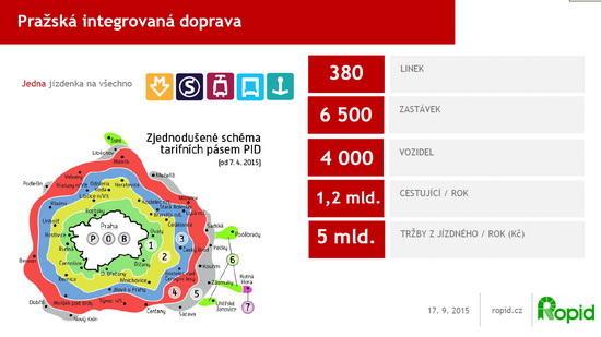 O lince 381: Trasa: Praha, Háje – Uhříněves – Říčany – Mukařov – Kostelec nad Černými lesy – Zásmuky – Kutná Hora Jde o nejdelší autobusovou linku v systému Pražské integrované dopravy (60 km) a zasahuje nejdále od Prahy (až do tarifního pásma 7). Jízdní doba je 100 minut. Denně na lince jezdí 10 převážně kloubových autobusů, které přepraví zhruba 3 600 cestujících. Linka 381 dostává moderní platební nástroj k 15letému výročí integrace autobusů na Černokostelecku. | Schéma Pražské integrované dopravy  Pražská integrovaná doprava Autor: ROPID - Klikněte pro zvětšení -