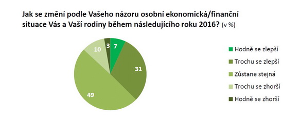 Podle průzkumu v roce 2015 změnila práci téměř pětina Čechů. Jednalo se nejčastěji o lidi do 30 let věku a s vysokoškolským vzděláním, ze třech pětin šlo o ženy. Kariérní vzestup v rámci současného zaměstnání zažilo zhruba osm procent lidí. Šest procent Čechů o práci přišlo. Každý desátý Čech uvedl, že během roku získal vyšší finanční částku, například díky výrazně lépe placenému zaměstnání, v rámci dědictví či díky výhře v soutěži. Rovněž každý desátý zaznamenal naopak ztrátu vyšší finanční částky či majetku - například kvůli výrazně hůře placenému zaměstnání, exekuci, krádeži či živelní události. Zatímco finanční obnos si na účet připsali zejména mladí lidé, kteří si budují kariéru, ztrátu větší peněžní částky zaznamenali lidé napříč populací. Stěhovali se zejména mladí lidé žijící ve velkých městech Změnu bydliště a s tím spojené stěhování zažilo loni 13 procent Čechů, v drtivé většině lidé do 30 let věku žijící zejména v Praze a dalších velkých městech. Častěji se stěhovaly ženy než muži (17 vs. 9 procent) a z hlediska vzdělání šlo nejčastěji o vysokoškoláky. Tři procenta Čechů si pořídila nový byt či dům a 12 procent své obydlí rekonstruovalo. Téměř třetina lidí si vybavila domácnost novým nábytkem, velkými spotřebiči, počítači či televizory apod. Nový či ojetý automobil si pořídilo 12 procent. Průzkum zjišťoval také rodinné a vztahové záležitosti. Například z něj vyplynulo, že osm procent lidí změnilo v roce 2015 partnera. Přiznaly to zejména ženy (12 vs. 4 procent). Téměř 18 procent Čechů se setkalo v rodině s těžkou nemocí či dokonce úmrtím. Zlepšení vlastní finanční situace očekávají téměř dvě pětiny lidí A jaký bude rok 2016? Podle průzkumu banky Cetelem jsou Češi ohledně právě začínajícího roku poměrně optimističtí. Ve zlepšení vlastní finanční situace přitom věří více než ve zlepšení státní. To, že se jejich osobní či rodinný finanční stav zlepší, si myslí 38 procent. Naopak zhoršení očekává 13 procent. Optimismus ohledně vlastních financí přitom klesá úměrně s rostoucím věkem a nižším dosaženým vzděláním. Ve zlepšení české ekonomiky věří 30 procent Čechů, 24 procent odhaduje, že se její stav zhorší. Při celkovém pohledu do budoucnosti jsou lidé nejčastěji mírnými optimisty (50 procent). V tomto roce očekávají Češi pozitivní změny v jejich životech častěji než v tom minulém, což vypovídá o zlepšující se náladě ve společnosti. Například pětina lidí se domnívá, že v nadcházejícím roce získají vyšší finanční obnos. Rovněž každý pátý se chystá koupit automobil. Dům či byt si chce pořídit 7 procent lidí, 22 procent plánuje větší rekonstrukci stávajícího domova. Vybavit si domácnost novým nábytkem, spotřebiči či výpočetní technikou chce 39 procent lidí. Stěhování v příštím roce už nyní očekává 16 procent Čechů, častěji přitom ženy než muži (20 procent vs. 12 procent). Z průzkumu banky Cetelem také vyplynulo, že každý osmý Čech si plánuje najít nového životního partnera. Více pozitivní nálady panuje také na poli pracovního života. Například téměř 14 procent lidí očekává kariérní vzestup. Každý čtvrtý Čech v průzkumu uvedl, že změní zaměstnání, ze třech pětin jde opět o ženy. O průzkumu: 1001 respondentů, obecná populace 18 - 65 let, sběr 17. - 21. prosince 2015  Výsledky výzkumu banky Cetelem o spokojenosti s rokem 2015 a o pohledu na rok 2016 Autor: Cetelem = Pro zvětšení klikněte =  Výsledky výzkumu banky Cetelem o spokojenosti s rokem 2015 a o pohledu na rok 2016 Autor: Cetelem = Pro zvětšení klikněte =  Výsledky výzkumu banky Cetelem o spokojenosti s rokem 2015 a o pohledu na rok 2016 Autor: Cetelem = Pro zvětšení klikněte =  Výsledky výzkumu banky Cetelem o spokojenosti s rokem 2015 a o pohledu na rok 2016 Autor: Cetelem = Pro zvětšení klikněte =  Výsledky výzkumu banky Cetelem o spokojenosti s rokem 2015 a o pohledu na rok 2016 Autor: Cetelem = Pro zvětšení klikněte =