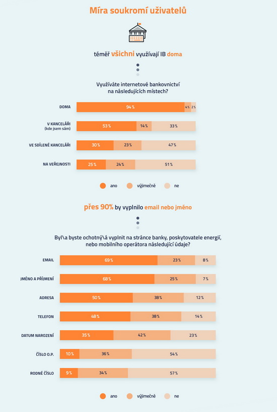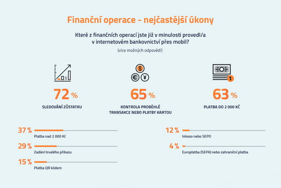 Třetina lidí, kteří mají v bance účet, používá internetbanking nebo mobilní bankovnictví denně. Necelých 40 % z nich pak využívá k přístupu na svůj účet mobilní aplikaci. Ti, kteří mobilní bankovnictví nepoužívají, mu vyčítají malé rozměry obrazovky. Nejčastěji lidé v mobilním bankovnictví sledují zůstatek na účtu nebo kontrolují proběhlé transakce. Z dalších funkcí je oblíbené placení menších částek, hledání pobočky nebo telefonního spojení do banky. S nabídkou funkcí mobilního bankovnictví jsou lidé většinou spokojeni.
