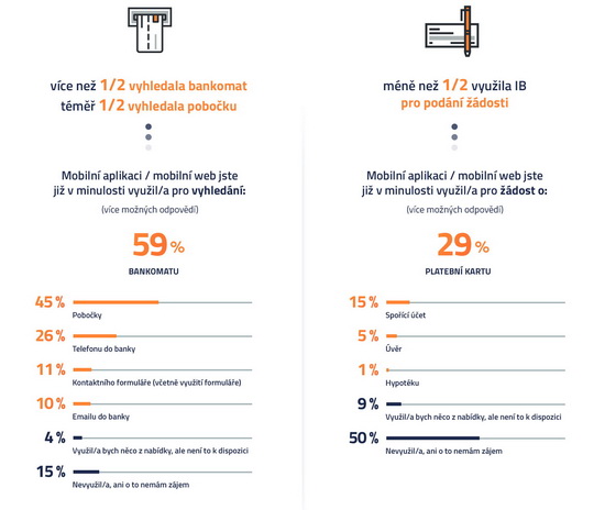 - přes mobilní aplikaci lidé také často hledají pobočku (45 %) nebo telefonní spojení do banky (26 %)