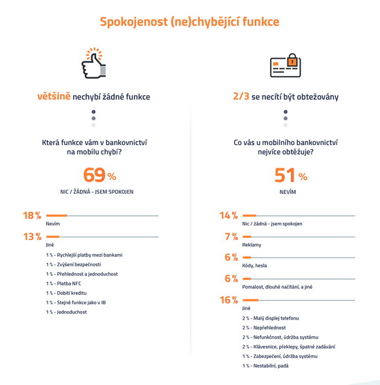 - lidem většinou v mobilním bankovnictví žádné funkce nechybějí (69 %). Zlomku lidí pak chybí např. rychlejší převody mezi bankami, vyšší bezpečnost, větší přehlednost a jednoduchost, NFC platby, možnost dobít kredit telefonu (pokud daná banka tuto funkci nenabízí) nebo chtějí všechny funkce, které běžně nabízí internetbanking