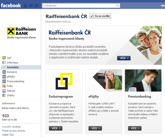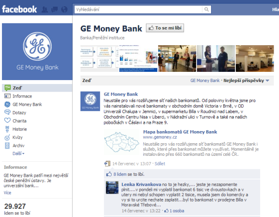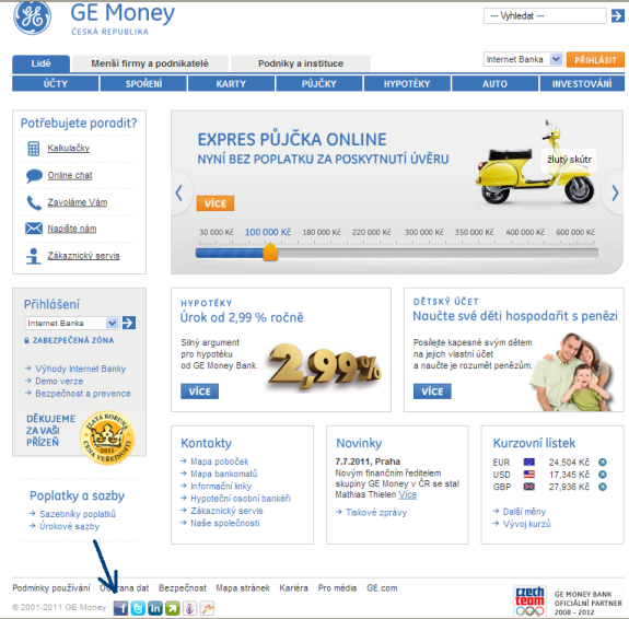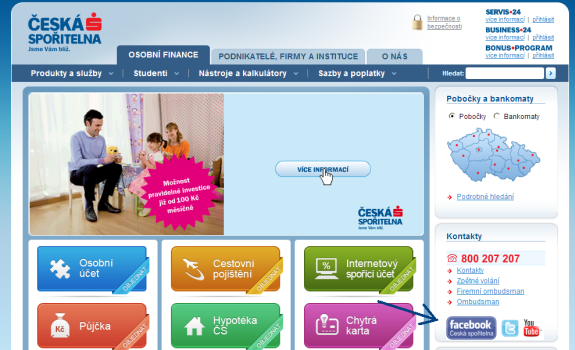 Umístění odkazu na Facebook na hlavní webové stránce banky: