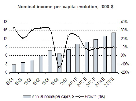 příjmů na osobu v Rusku od roku 2004. Příjem se