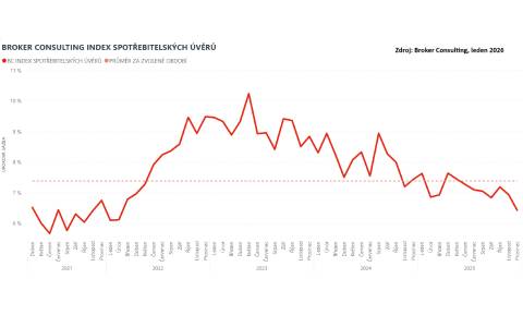 Broker Consulting Index spotřebitelských úvěrů dosáhl v prosinci hodnoty 6,43 %. Oproti listopadu tak průměrná sazba klesla o výrazných 0,51 procentního bodu a zařadila se mezi nejnižší hodnoty roku 2025. Zároveň se průměrná sazba dostala na nejnižší úroveň za posledních 46 měsíců. Nižší hodnota byla zaznamenána naposledy v únoru 2022 (6,12 %). „Prosincový pokles je do značné míry dán konkurenčním prostředím na trhu a kampaněmi jednotlivých bank, které v závěru roku tradičně vrcholí. Průměrná sazba se díky tomu dostala na úroveň, která patří k nejnižším za poslední roky,“ říká Michaela Pudilová, analytička spotřebitelských a hypotečních úvěrů Broker Consulting. U spotřebitelských úvěrů nejsou výraznější meziměsíční výkyvy ničím výjimečným, což ukazují také hodnoty, které Broker Consulting Index v průběhu roku zaznamenal. Jaký byl vývoj minulý rok? Rok 2025 začínal hodnotou 7,63 %, v únoru sazba klesla na 6,86 % a v březnu se mírně zvýšila na 6,93 %. Jarní měsíce následně přinesly nárůst, když se v dubnu průměrná sazba vyšplhala až na 7,64 %. V dalších měsících se sazby opět pomalu snižovaly – v květnu činily 7,45 %, v červnu 7,27 % a v červenci 7,10 %. Podzimní měsíce pak přinesly další výkyvy, které vyústily až v prosincový pokles na 6,43 %. Meziroční srovnání ukazuje, jak výrazně se v posledních letech měnila průměrná sazba spotřebitelských úvěrů. Zatímco v prosinci 2021 se pohybovala na úrovni 6,75 %, následující rok přinesl prudký nárůst až na 9,49 %. Od té doby se průměrná sazba postupně snižuje – v prosinci 2023 činila 8,84 % a v roce 2024 klesla na 7,44 %. Aktuální prosincová hodnota 6,43 % je tak ve srovnání s předchozími roky nejnižší.  Graf Broker Consulting - Vývoj Index spotřebitelských úvěrů Autor: Broker Consulting = Pro zvětšení klikněte na obrázek = Žebříček spotřebitelských úvěrů v říjnu 2025 na Finparádě.cz V říjnu 2025 byl na Finparádě.cz aktualizován žebříček spotřebitelských úvěrů. Hlavním kritériem pro jejich hodnocení bylo RPSN (náklady na půjčku z průměrné úrokové sazby dle metodiky ČNB a kalkulaček jednotlivých bank). Reálnou průměrnou úrokovou sazbu, kterou banky svým klientům skutečně poskytují, mají povinnost reportovat České národní bance, která její výši pravidelně zveřejňuje jako průměr za celý bankovní trh. Finparáda.cz pracuje s daty za jednotlivé banky, které jí výši sazby poskytují. Dále berou odborníci v potaz i veřejně prezentovanou úrokovou sazbu, kterou banky uvádějí ve svých kalkulačkách na webových stránkách. | Pořadí | Banka | Produkt | Minimální prezentovaná úroková sazba | | 1. | Trinity Bank | Lepší půjčka | 3,99 % p.a. | | 2. | MONETA Money Bank | Expres půjčka | 4,40 % p.a. | | 3. | Air Bank | Půjčka | 4,40 % p.a. | | 4. | mBank | mPůjčka Plus | 4,49 % p.a. | | 5. | Česká spořitelna | Půjčka | 4,39 % p.a. | Zdroj: Finparáda.cz, revize úrokových sazeb 14.1.2026 První místo v žebříčku získala Trinity Bank, jejíž Lepší půjčka nabízí úrokovou sazbu 3,99 % p.a. při řádném a včasném splácení. Pokud se klient 3x zpozdí v délce 7 a více dnů, získá sazbu ve výši 9,99 % p.a. Půjčku banka poskytuje od částky 20 000 Kč až do 1 500 000 Kč. Za předčasné splacení klient neplatí žádný poplatek. K půjčce je nabízeno také pojištění schopnosti splácet. Pojištění nabízí dva balíčky podle počtu krytých pojistných rizik. Na druhém místě se umístila MONETA Money Bank, u které si mohou klienti půjčit od 4,40 % p.a. Půjčku banka poskytuje od částky 5 000 Kč až do 1 500 000 Kč. V některých případech si banka může nárokovat náhradu nákladů spojených s předčasným splacením. Zákon stanovuje maximální výši této náhrady na 1 % z předčasně splacené částky, pokud do konce úvěru zbývá více než rok, a 0,5 %, pokud je tato doba kratší. K půjčce je nabízeno pojištění schopnosti splácet. Na třetím místě je Air Bank, jejíž Půjčka nabízí bonusovou úrokovou sazbu od 4,40 % p.a. Tu klient získá za řádné splácení úvěru, bez řádného splácení je sazba od 5,40 % p.a. Půjčku banka poskytuje od částky 5 000 Kč až do 1 500 000 Kč. Za předčasné splacení banka žádný poplatek neúčtuje. Při splacení první půjčky do 30 dnů od načerpání vrací banka úroky. K půjčce je nabízeno pojištění schopnosti splácet. Čtvrté místo patří mBank s mPůjčkou Plus, díky které si klienti mohou půjčit s úrokovou sazbou od 4,49 % p.a. Půjčku banka poskytuje od částky 10 000 Kč až do výše 1 200 000 Kč. Za předčasné splacení klient neplatí žádný poplatek. K půjčce je nabízeno pojištění schopnosti splácet. Na pátém místě se umístila Česká spořitelna s Půjčkou a úrokovou sazbou od 4,39 % p.a. Půjčku banka poskytuje od částky 2 000 Kč až do 2 500 000 Kč. Česká spořitelna vám odpustí až 12 splátek při řádném splácení. Půjčenou částku lze do 30 dnů vrátit. K půjčce je nabízeno pojištění schopnosti splácet v různých variantách podle počtu krytých pojistných rizik a vstupního věku. Metodiku k žebříčku spotřebitelských úvěrů na Finparádě najdete zde Proč se akční sazba nemusí shodovat s výslednou nabídkou? Nízká sazba často budí dojem výhodné nabídky, ve skutečnosti ale záleží na celé řadě dalších podmínek. Akční sazby jsou obvykle navázány na konkrétní parametry úvěru nebo typ klienta. Výsledná nabídka se tak může lišit od původně uváděné sazby. Rozdíly přitom nemusí být patrné na první pohled a často se projeví až při detailnějším nastavení úvěru. „Akční sazby mají přede