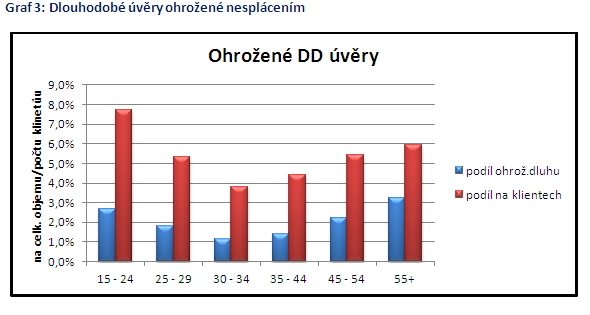 Graf podílu klientů ohrožených dlouhodobých úvěrů k celkovému počtu klientů s dlouhodobým úvěrem podle věkové struktury