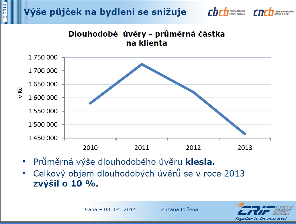 Informace promítané na tiskové konferenci Bankovního a Nebankovního registru klientských informací konané 3. dubna 2014 v Praze. Na snímku vývoj průměrné částky dlouhodobého úvěru na klienta.