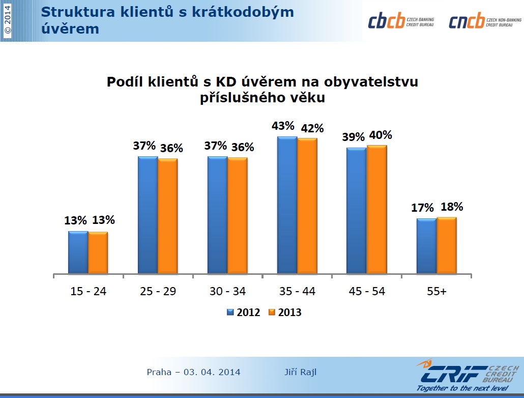 Informace promítané na tiskové konferenci Bankovního a Nebankovního registru klientských informací konané 3. dubna 2014 v Praze. Na snímku podíl klientů krátkodobého úvěru na obyvatelstvu v příslušné věkové skupině.