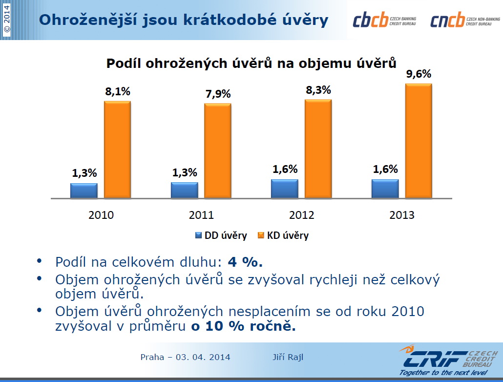 Informace promítané na tiskové konferenci Bankovního a Nebankovního registru klientských informací konané 3. dubna 2014 v Praze. Na snímku podíl ohrožených úvěrů na celku.