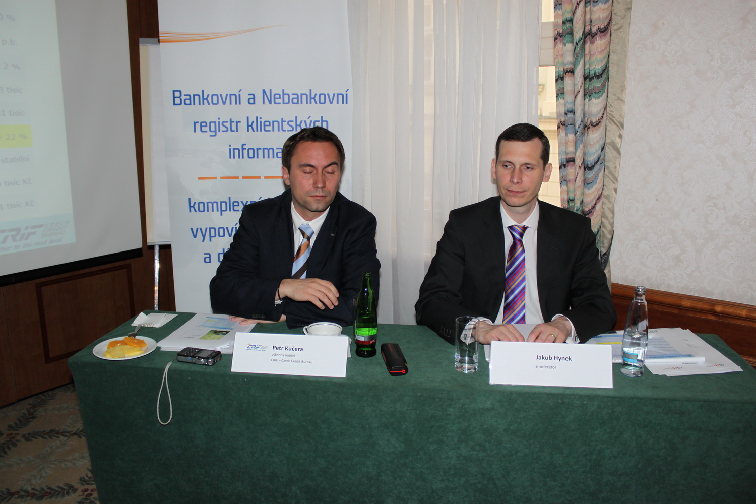 Úvěry v roce 2013 - Tisková konference Bankovního a Nebankovního registru klientských informací konaná v Praze 3. dubna 2014. Na snímku Petr Kučera, výkonný ředitel CRIF - Czech Credit Bureau, a Jakub Hynek, modrátor tiskové konference.