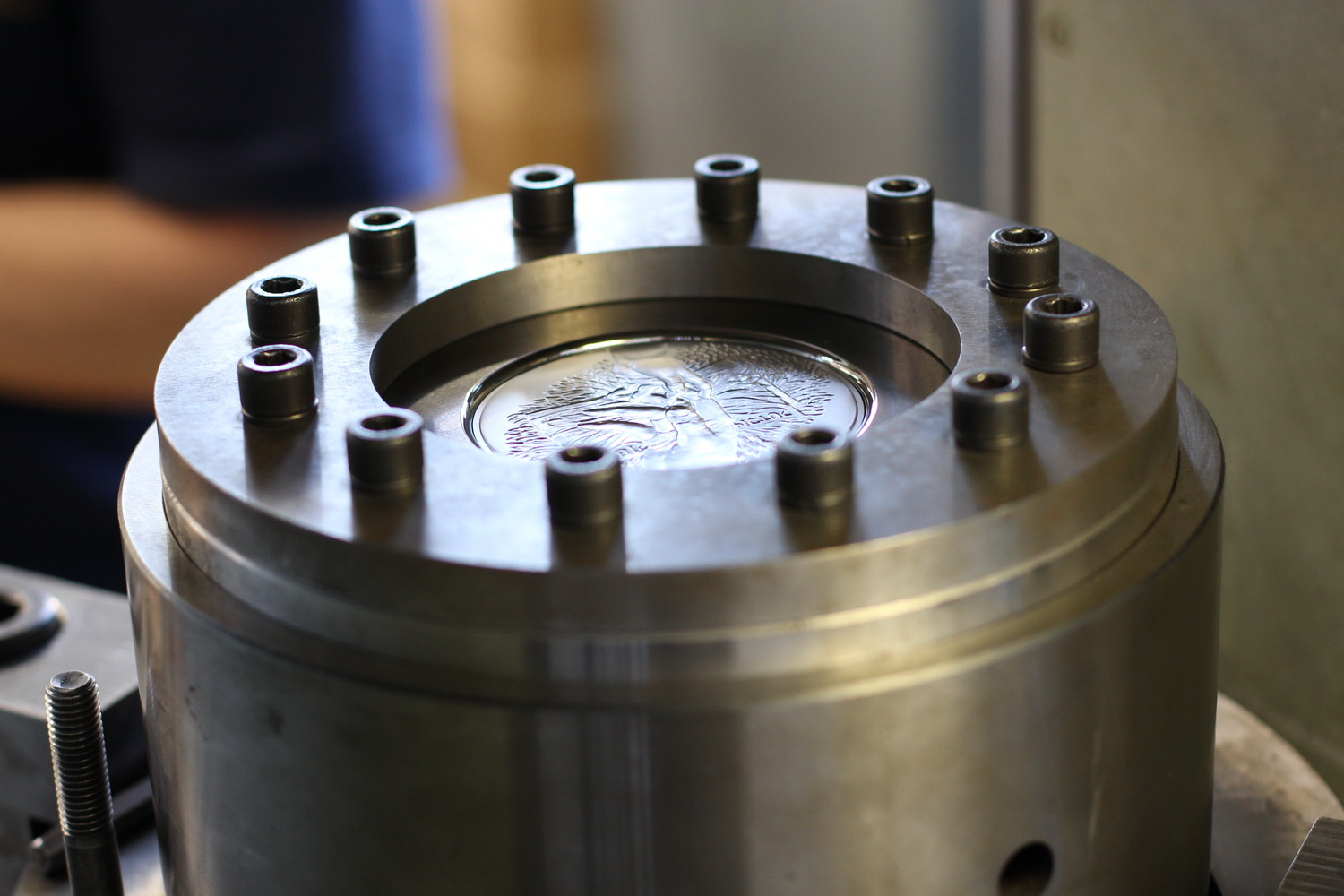 Ražba zlaté medaile s portrétem J.A.Komenského. Na snímku lisovací stroj.