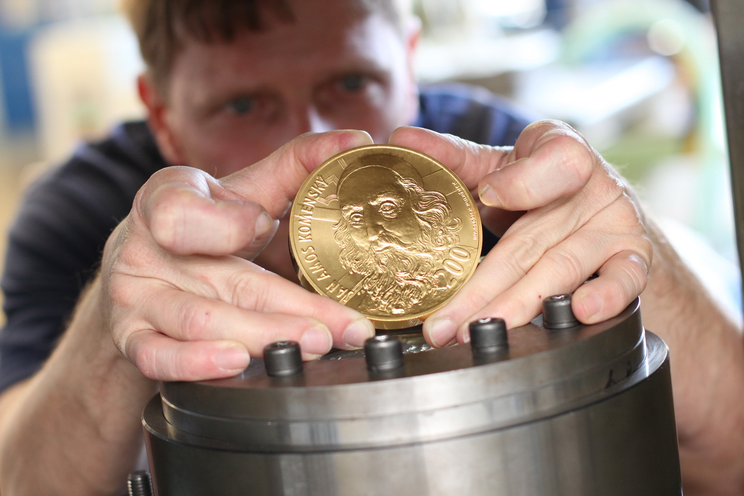 Ražba zlaté medaile s portrétem J.A.Komenského