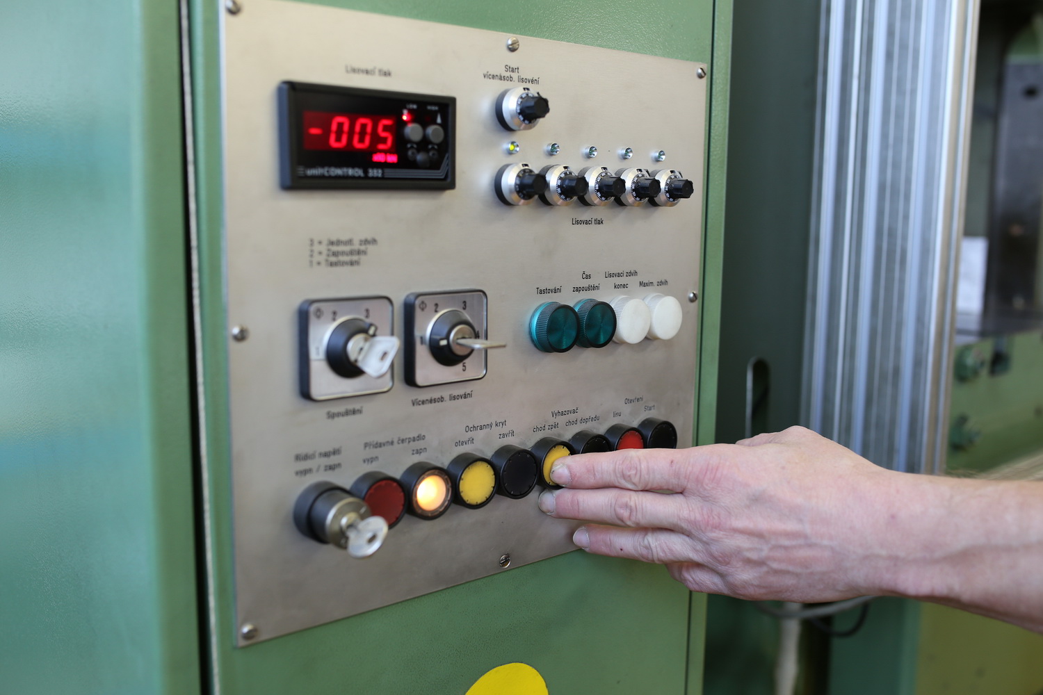 Ražba zlaté medaile s portrétem J.A.Komenského. Na snímku lisovací stroj.