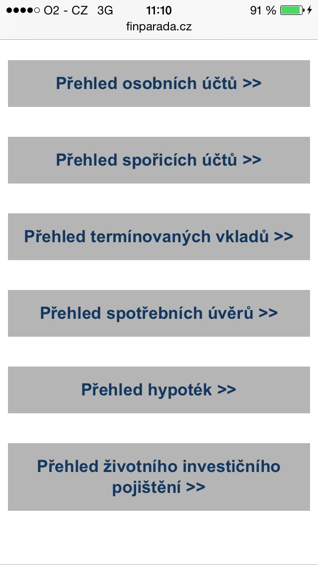 Stránka s rozcestníkem na jednotlivé přehledy produktů podle jejich typu (Mobilní Finparáda.cz)