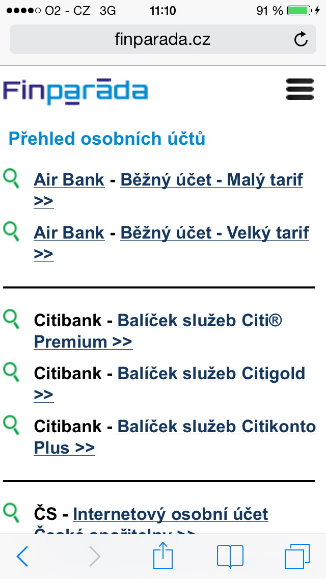 Přehled osobních účtů na Finparádě. Zde vyberete název konkrétního produktu a získáte o něm následně detailní informace (Mobilní Finparáda.cz).