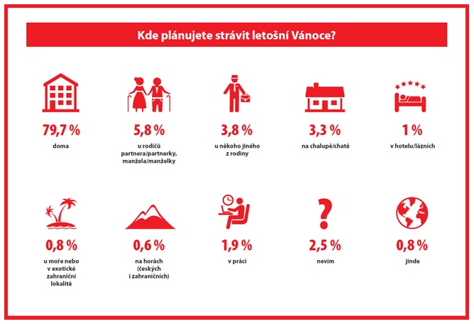 Čechům se líbí představa, že by Štědrý den oslavili v širokém rodinném kruhu mimo domov, například na pronajaté chalupě v horách. 93 % by jich navíc na takovou akci finančně přispělo. Lidé jsou zároveň připraveni na to, že aby vše klaplo, budou muset něco obětovat. Polovina je ochotna strpět i příbuzné, které normálně moc nemusí. Jaká je ale realita? Většina Čechů bude na Štědrý den doma v klidné společnosti těch nejbližších. Důvodem je hlavně to, že se nenajde nikdo, kdo by vánoční oslavu pro širokou rodinu zorganizoval. Zjistil to průzkum, který pro společnost Home Credit realizovala agentura STEM/MARK.
