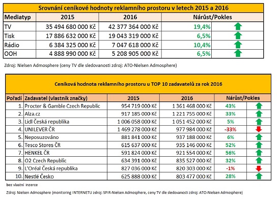 Z monitoringu Ad Intel společnosti Nielsen Admosphere, který každoročně nabízí pohled do celoročních dat ceníkových hodnot umístěné reklamy, vychází televize jako nejsilnější mediatyp roku 2016. Inzerce v ní zveřejněná loni dosáhla hodnoty 42,4 miliard korun, což je zároveň o 19 % více než v roce 2015. Další mediatypy jako rádio, tisk a OOH si v rámci monitorovaných zdrojů rovněž meziročně polepšily. Největším zadavatelem byla v roce 2016 společnost Procter & Gamble Czech Republic.
