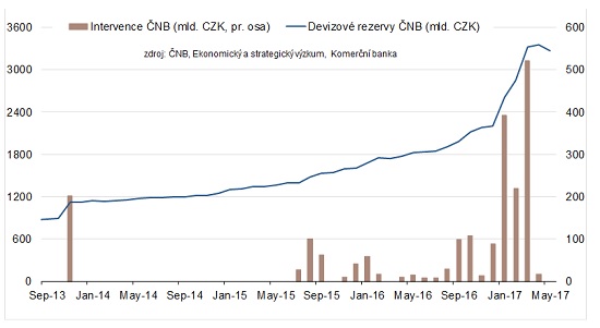 Devizové rezervy ČNB se především kvůli masivním intervencím nafoukly ze zhruba 900 miliard korun v říjnu 2013 (22 % HDP) na 3 355 miliard v dubnu 2017 (71 % HDP).
