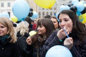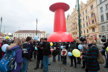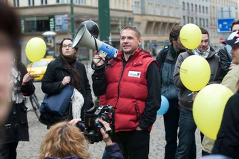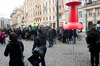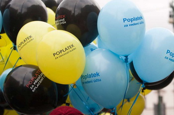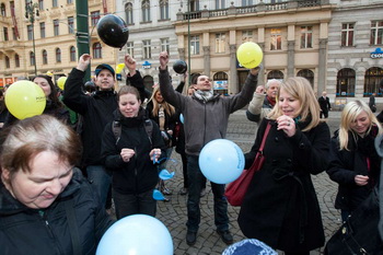 Přesně v 16,00 začal moderátor odpočítávat a na jeho pokyn všichni společně své balónky představující bankovní poplatky propíchli připínačky.