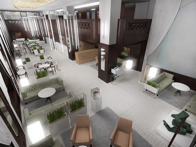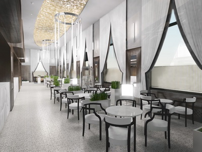 K tomu, aby námět vyšel naplno, je uzpůsoben také interiér a materiály v něm použité. Dřevěné obložení a zábradlí je z kvalitního exotického dřeva merbau, litá teracová podlaha bude připomínat jemně zrnitou palladiánskou litou dlažbu a bar bude řešen v původním autorském charakteru interiéru s plastickým výrazem jednoduchého pultu z carrarského mramoru. „Z důvodů pozitivního vztahu přirozeného lidského vnímání k ornamentu, se v interiéru také pracuje s elegancí krásných tkanin a jednoduchým soudobým dekorem látek a potahů. Část prostoru, zejména na galerii a v menší části přízemí bude věnována pohodlí návštěvníků ve stylu evokujícím klubovou atmosféru,“ uzavírá architekt Petr Hrůša.