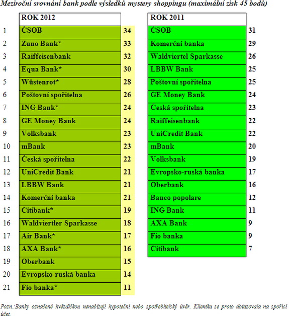 Podle celkových výsledků mystery shoppingu získala nadprůměrný počet bodů polovina bank. K maximu stanovenému na 45 bodů se nejtěsněji přiblížila ČSOB (34 bodů) následovaná Zuno Bank (33 bodů) a Raiffeisenbank (32 bodů). Zatímco Zuno v loňských statistikách ještě nefigurovala, ČSOB potvrdila loňské prvenství a navíc zvýšila svůj zisk o tři body. Raiffeisenbank si polepšila o rovných deset bodů a pět příček.