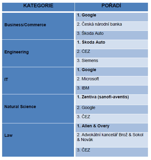 V Praze byl ve čtvrtek 6. února 2014 v rámci prvního ročníku slavnostního vyhlášení cen Universum Awards zveřejněn žebříček „Top 100 IDEAL Employers“, který hodnotí společnosti působící v České republice na základě preferencí studentů českých vysokých škol a univerzit. Kromě nadnárodních gigantů zvučných jmen obsahuje seznam také nejvýznamnější domácí hráče na trhu. Hned ve dvou kategoriích (Business/Commerce a IT) zvítězila společnost Google. Mezi technickými obory vévodí Škoda Auto, v přírodních vědách výrobce léčiv Zentiva. Nejprestižnější mezi právnickými společnostmi je podle průzkumu Allen & Overy.